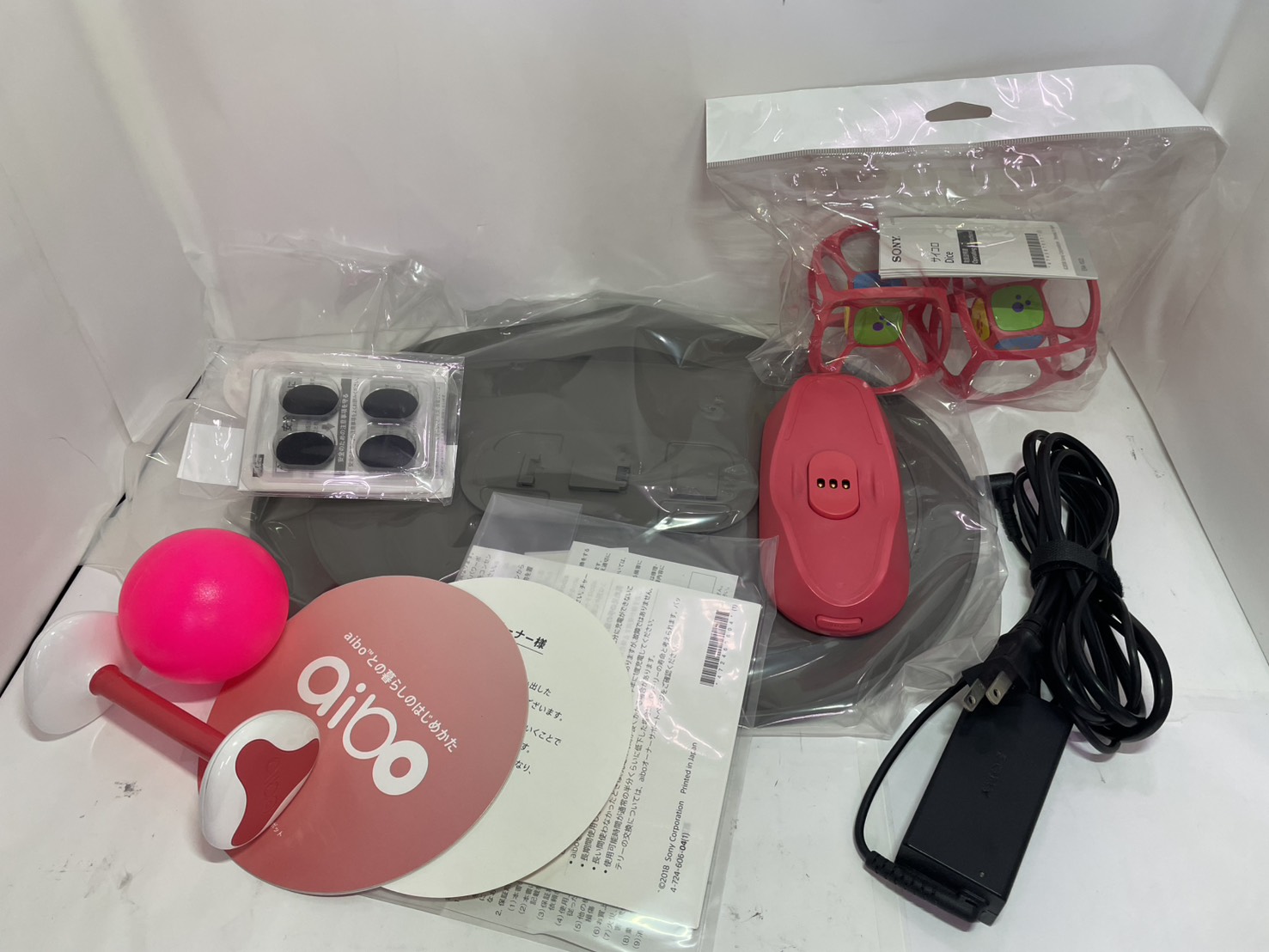 [付属] 外箱、ACアダプター、充電台、サイコロx2、ボール、骨のおもちゃ、足裏パッド、マニュアル