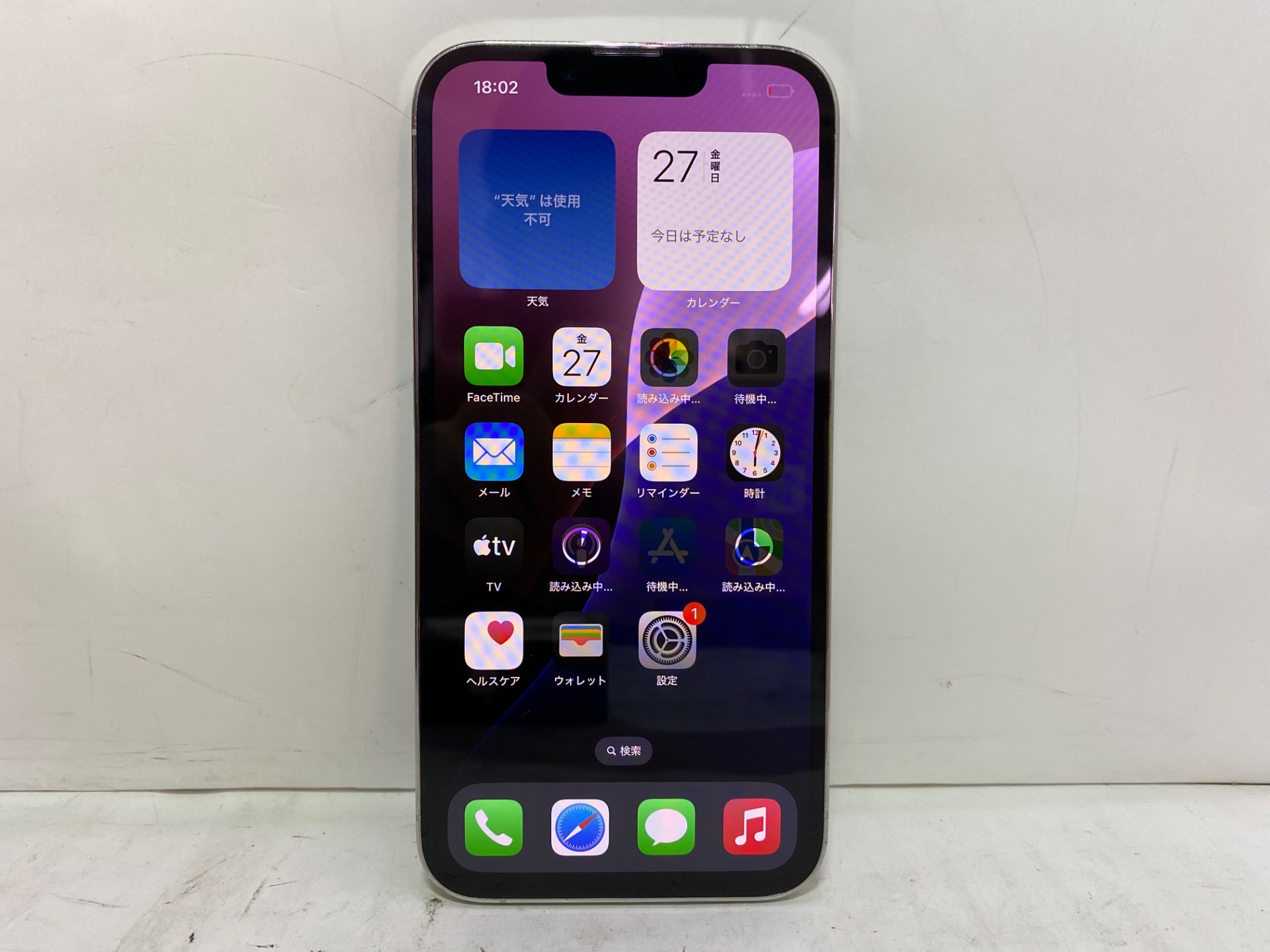 [スペック] iOS 18.6.2/A15/128GB ROM/6.1タッチ(2532x1170)/1200万画素カメラ/GPS/Wi-Fi/Bluetooth/SIMフリー/デュアルSIM(nano-SIM/eSIM)/バッテリー77%サービス表示/au〇